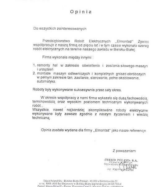 Teksid Poland - montaż oświetlenia 20 centrów obróbczych wraz z całą instalacją sterowników komputerowych i wizualnych. |