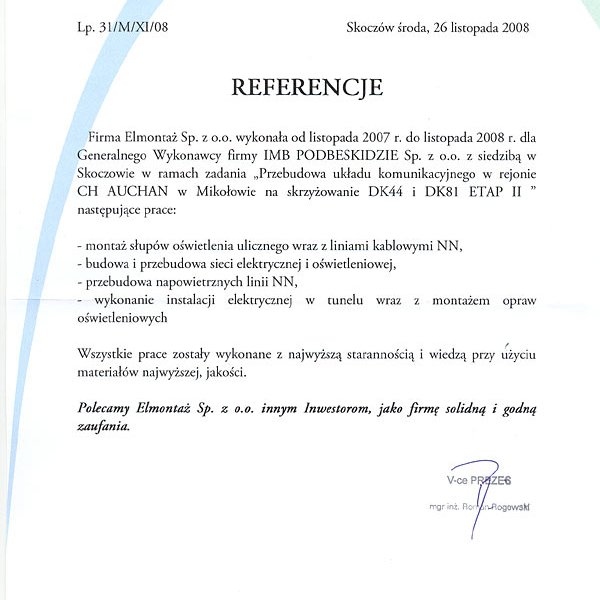 Oświęcim ul.Fabryczna, Gmina Miasto Oświęcim, przyłączenie zakładu produkcyjnego budowa ZK SN linii kablowej SN- etap I |